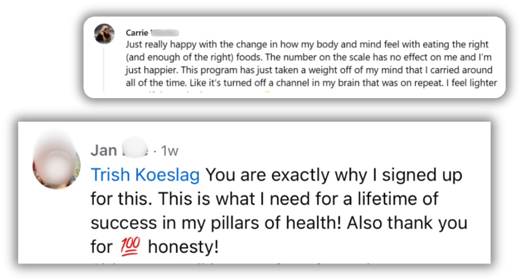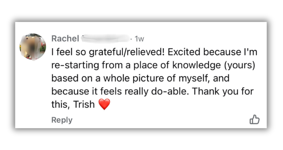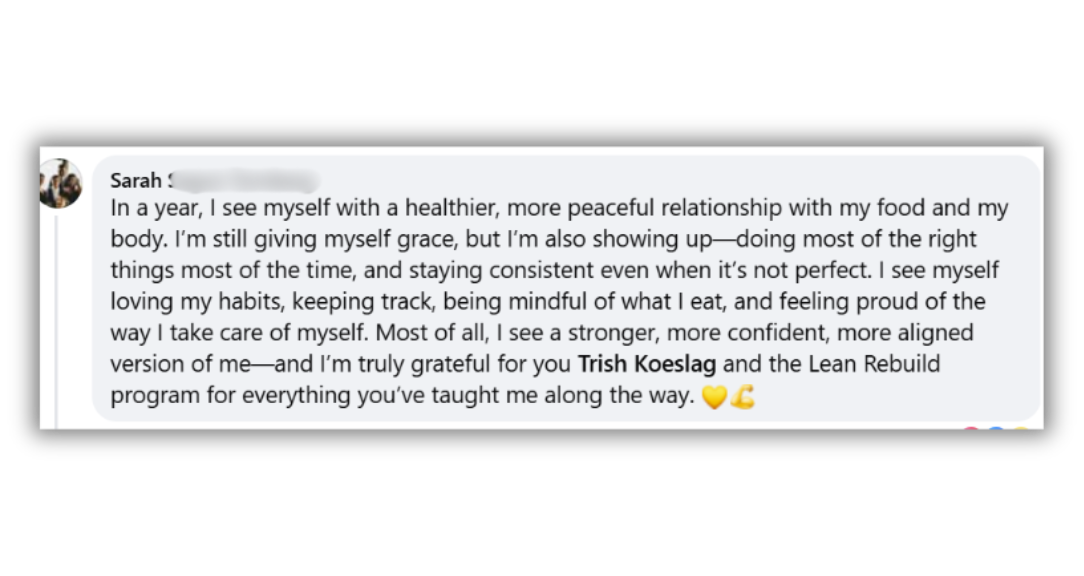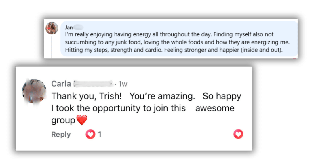 I’ve stuck with this program for over a year and built lifestyle habits I’ll use forever. That’s my biggest success. Thank you, Coach Trish, my number one cheerleader! Big love and hugs!”